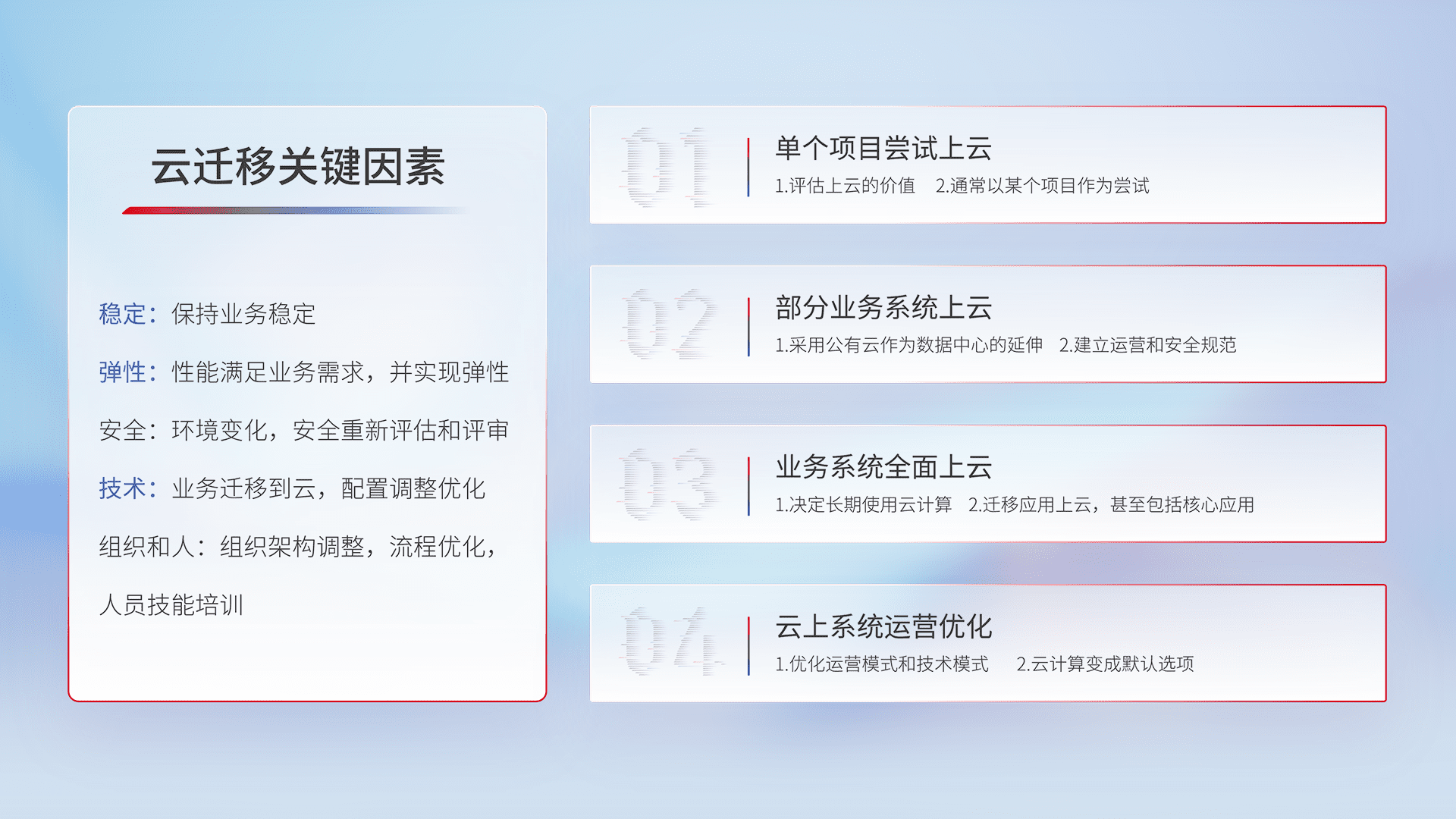 结合实际业务,,,,从规划设计、、云平台选型、、、、云原生改造、、数据迁移、、集成交付,,,迁移全过程为客户识别最佳上云路径,,,,做好风险识别管理,,设计网络架构、、、身份权限、、、安全审计合规、、、操作审计、、、日志审计、、、监控告警策略、、、多站点容灾设计等,,,,对云上基础设施进行整体规划,,,提升IT治理水平,,,,以满足弹性、、、高可用、、、、高性能的需求。。